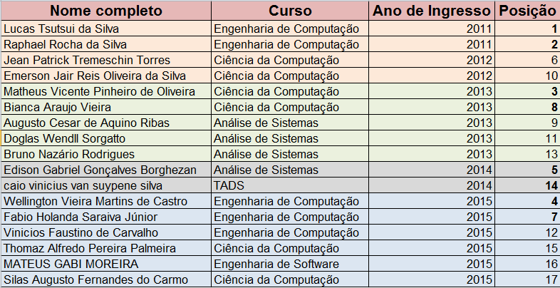 Como descrito nas regras da competição, a classificação final foi dividida em 4 categorias de acordo com o ano de ingresso: 2015, 2014, 2013 e anterior a 2013. O primeiro e segundo colocados de cada categoria foram premiados com pen drives de 32gb e 16gb, respectivamente.